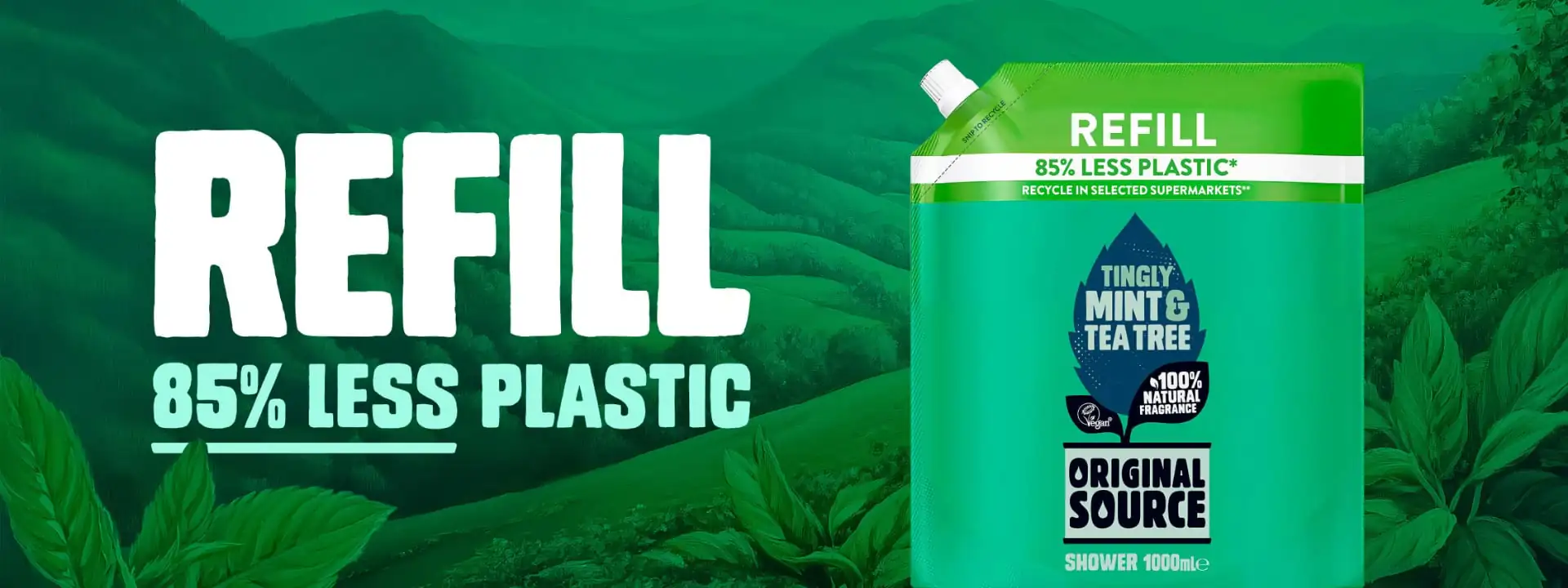 Give the side-eye to your plastic footprint and enjoy your favourite Original Source shower gels again and again with our Shower Refill pouches. Our eco-savvy pouches contain 85% less plastic than four 250ml bottles. Bigger packs = a bigger difference. Time to ride the wave of change and make every splash count.